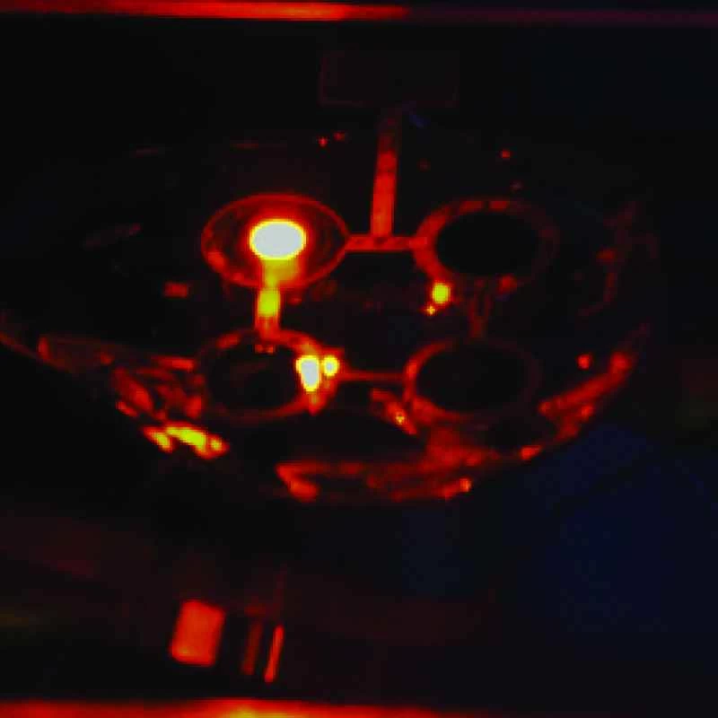 印刷されたLEDは5層構造です。下層には銀ナノ粒子でできた金属リングがあり、電気回路への金属接点として機能します。その上には2つのポリマー層(どちらも非常に長い化学名を持っています)があり、これらが連携して電流を次の層に供給し、送り返します。この層には量子ドットが含まれています。量子ドットは、硫化亜鉛の殻に包まれたセレン化カドミウムナノ粒子でできています。電子がこれらの量子ドットに衝突すると、オレンジ色または緑色の光を発します。光は共晶ガリウムインジウムでできた陰極層で覆われており、電子はここを通ってLEDから流れ出ます。