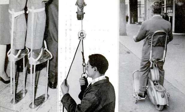 ポピュラーサイエンス誌は、常に不条理なものに深い愛着を抱いてきました。第13回ブリュッセル国際発明展を特集した時、私たちはどんな体験をするのか覚悟していました。20カ国から1,000人の発明家が集まり、それぞれの発明品を披露しました。左側の竹馬は最大60センチまで伸び、観客で混雑するイベントでも使用できましたが、後方に立っている人たちは大変腹を立てていました。中央の写真は、登山家や火災現場からの脱出用に設計された降下装置です。右側は、バランス感覚に問題のある人のために、格納式のサイドホイールを備えた安全スクーターです。