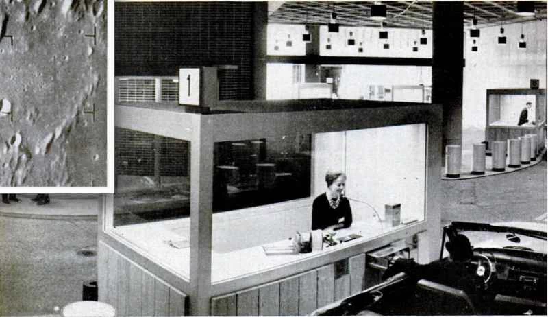 人類が月面に着陸できるのはあと5年後ですが、まだ夢はあります!左の写真は、レンジャー7号が初めて月の凹凸のある地形を詳細に捉えたものです。右の写真は、訓練中の宇宙飛行士が宇宙船の模型に乗っているところです。