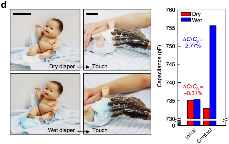 研究者たちは、やや型破りな方法で湿度センサーをテストしました。まず、人工皮膚の湿度測定値を市販の湿度センサーの測定値と比較したところ、結果はほぼ一致しました。これは通常の手順です。しかし、科学的にさらに厳密にするために、研究者たちは義手で様々なおむつを触らせました。すると、濡れたおむつと乾いたおむつを区別できることが分かりました。成功です!