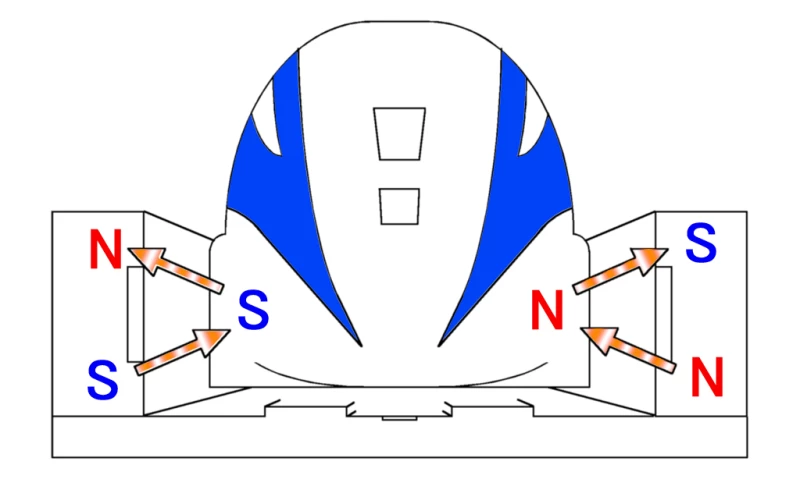 磁気浮上式鉄道は、転がるのではなく浮上します。線路に沿って走る磁化されたコイルが、車両の台車に設置された磁石と反発し、列車を線路から少し浮上させます。そして、線路脇の壁に埋め込まれたコイルによって発生する移動磁場によって、列車は前方に引っ張られます。