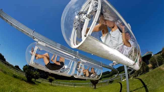 シュイーブは昨年の夏、奇抜ながらも人目を引く観光名所として初めて登場しました。これはモノレールシステムで、透明なプラスチック製のペダル駆動式の丸い「車両」がモノレールの下に吊り下げられています。7段ギアを備えた車両は、同社のニュージーランド本社に設置された218ヤードの試験走行コースで走行試験が行われ、短距離では時速30マイル(約48キロ)近くに達するとされています。