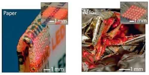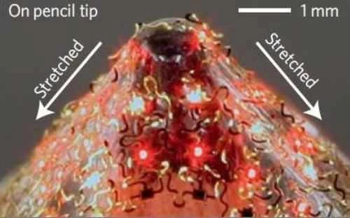 しかし、イリノイ大学の研究者ジョン・ロジャース氏が指摘するように、LEDは脆く、さまざまな形に曲げることができません。ところが、彼の新しい発明のおかげで、もう問題は解決しました。彼とチームは、ペン先よりも小さな極小のLEDをフレキシブル電子シートに搭載しました。このシートは、LEDの機能を損なうことなく最大720度まで伸縮可能で、石鹸水や皮膚の下にも耐えることができます。彼らはマウスの皮膚の下にシートを1枚埋め込むことで、この耐久性を実証しました。