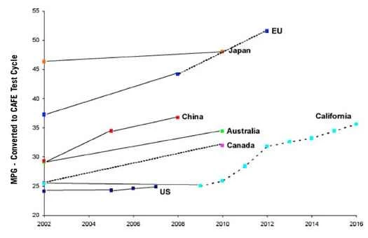 ピュー地球気候変動センターが2004年12月に発表したこの図は、世界各国の燃費規制の標準化された比較を示しています。これは依然として残念なグラフであり、規制の欠如がいかに極めて重要な技術へのイノベーションを阻害するかを如実に示しています。私たちは、アメリカ的な気概を振りかざして、車が高価なガソリンをこれほど多く消費せず、温室効果ガスの排出量を減らし、あるいは化石燃料を完全に廃止する日が来ると、いくらでも語り、夢想することができます。しかし、当初は抵抗を感じるかもしれませんが、強い後押しこそが、自動車会社のような巨大企業を行動に移すために必要なのです。そして、それは明らかに世界の他の地域で効果を発揮しています。