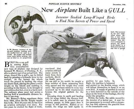 キティホークでの飛行に備えて、ライト兄弟はハトの動きを研究し、空気より重いハトがどのようにして空中に留まるのかを解明しました。彼らの成功は、多くの後継者たちに自然の様々な側面を研究することで飛行機の改良を促すきっかけとなりました。オービル・ライトの弟子の一人は、カモメを捕獲して剥製にし、翼幅を調べました。彼のカモメ飛行機は、裏庭で離着陸できたと伝えられていますが、実際にはカモメに似ていました(上の写真参照)。一方、二人のフランス人発明家は、回転するプラタナスの種子を研究し、同じ動きを逆向きにホバリングするヘリコプターに適用しようと試みました。