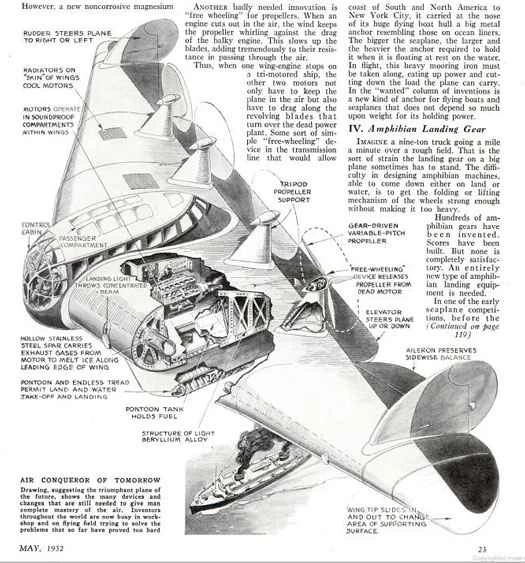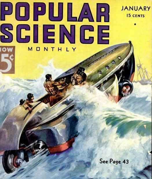 おまけに、1930年代のちょっと変わった水上飛行機もいくつか載せました。「明日の空の覇者」というタイトルのイラストに、誰が抵抗できるでしょうか? これらのコンセプトは、今にして思えばちょっと突飛に思えるかもしれませんが(水陸両用自転車を見れば一目瞭然です)、現在運用されている水陸両用車とそれほど変わりません。例えば、あるフランス人発明家は、ダックツアーで使われているものと似た水中ツアーバスを設計しました。ただし、彼のバスは実際に水中に潜ることができました。