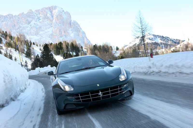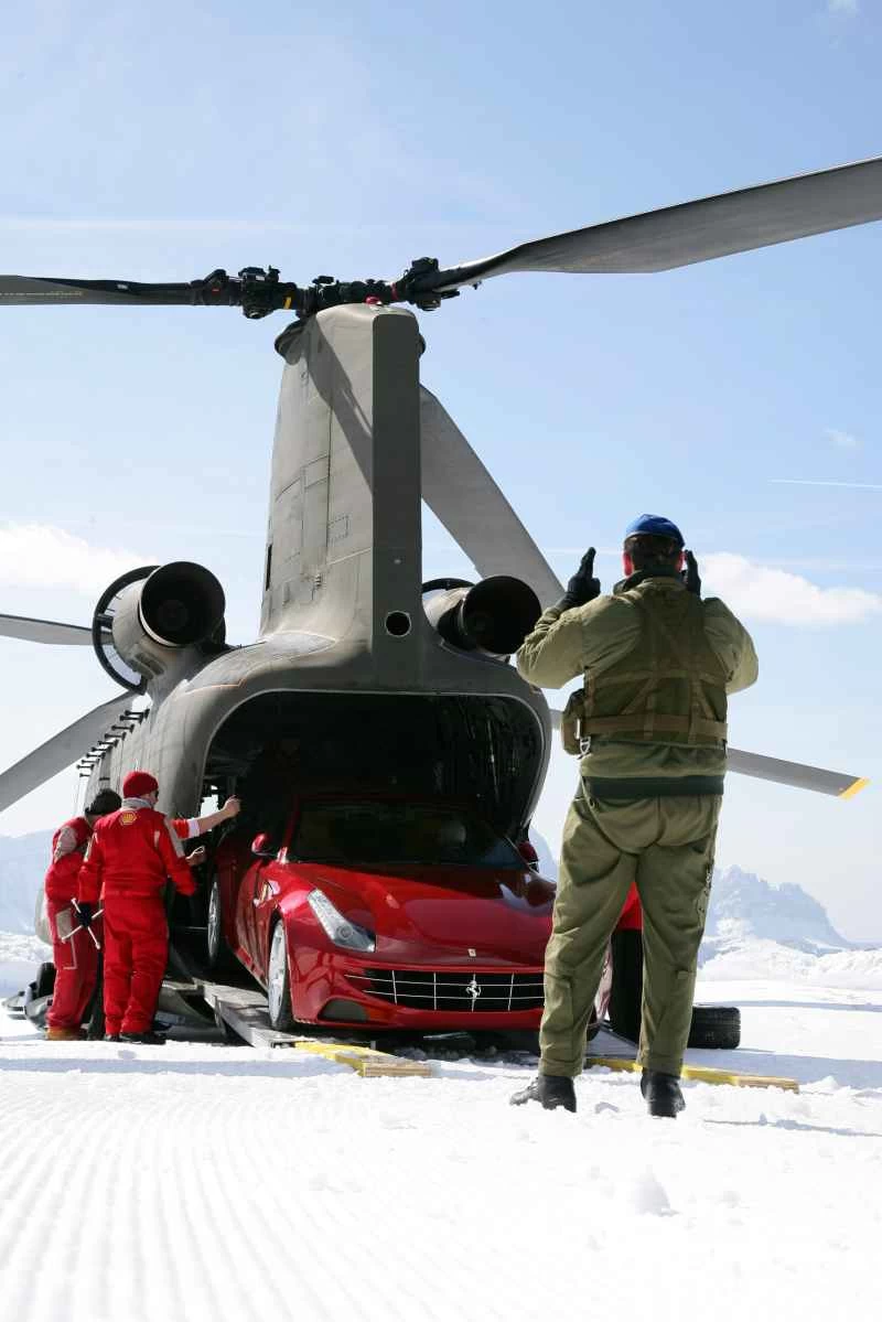 イタリア、ブルニコ発― 雪に覆われたKマートの駐車場でも十分だっただろう。しかし、ここはフェラーリ、そしてその主役である伝統を打ち砕くFF(30万ドルの四輪駆動ステーションワゴン)なのだから、高高度でのちょっとした見せびらかしは当然だろう。そこでフェラーリは、イタリア軍のチヌーク・ヘリコプターの支援を受け、2機のFFを、風の強いドロミテ山脈にある人気スキーリゾート、プラン・デ・コロネスの山頂まで飛ばし、我々に試乗を勧めた。とんでもない話?もちろん、その通りだ。しかし、時速332キロ、651馬力のイタリアのポニーが、ポモナ・フリーウェイの雪、氷、土、水たまりの上を安全に疾走しながら、長身の大人4人と荷物を乗せることができるのと比べれば、とんでもない話ではない。