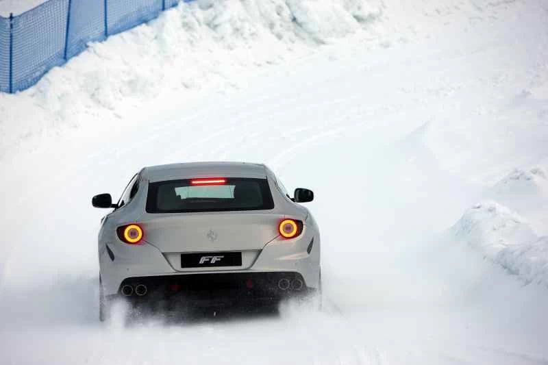 標高7,464フィートの山頂で、ゴーグルをつけたスキーヤーたちが驚きながら見守る中、私はフェラーリ初の四輪駆動車に慣れ始めた。