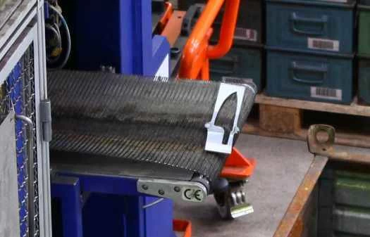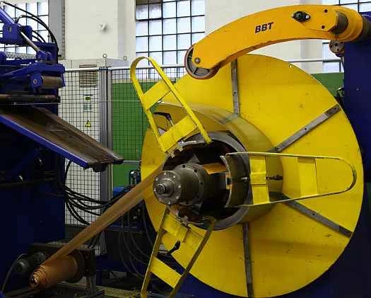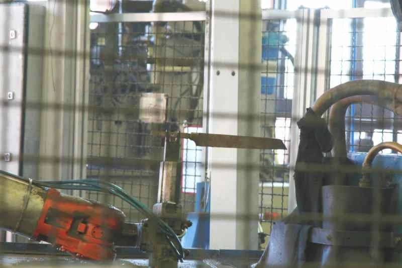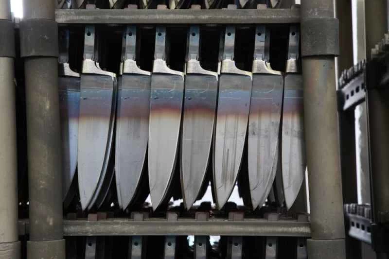 原材料は、ナイフほどの厚さの鋼板が巻かれた巨大なスプールに巻き付けられて工場に運ばれます。鋼板は個々のナイフとなる素材へと切り出されます。スプールから素材が取り出されてから、反対側の端にある完成したナイフが出てくるまで、約3週間かかります。