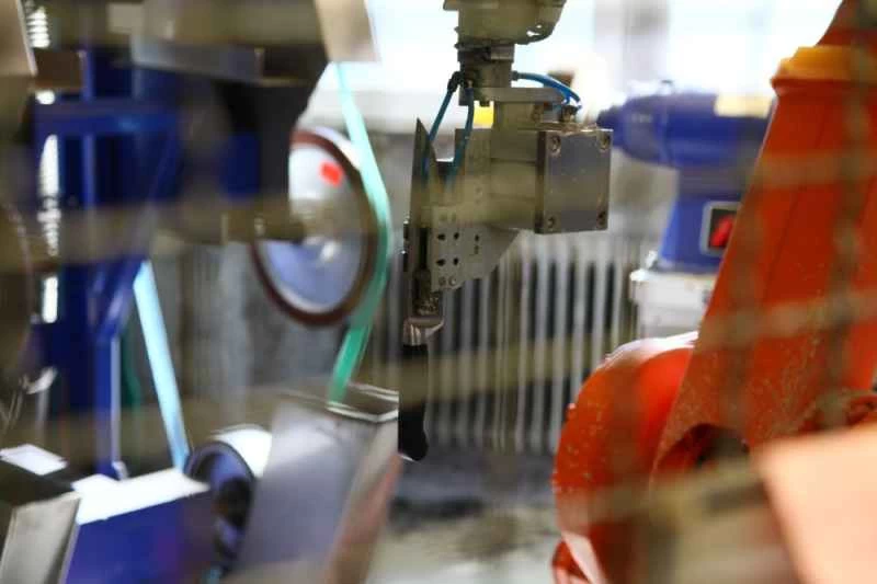 ナイフは別の一連のロボットの手に渡り、研削ホイールを使って厚めの素材を刃の先細りの輪郭に削り落とす。ただし、これはあくまでも大まかな作業で、細かい研磨や研ぎ、そしてハンドルの取り付けは工場の作業員に任される。作業員たちはふわふわのグレーのオーバーオールを着て、仕事が非常に上手で、何世代にもわたるナイフ職人の家系出身であることからくる自信を漂わせている。木製のハンドルはナイフの柄に接着され、リベットで固定される。プラスチック製のハンドルは、柄を加熱して既存のハンドルに差し込むだけで簡単に取り付けられる。ハンドルのエッジはロボットによって滑らかに仕上げられる。