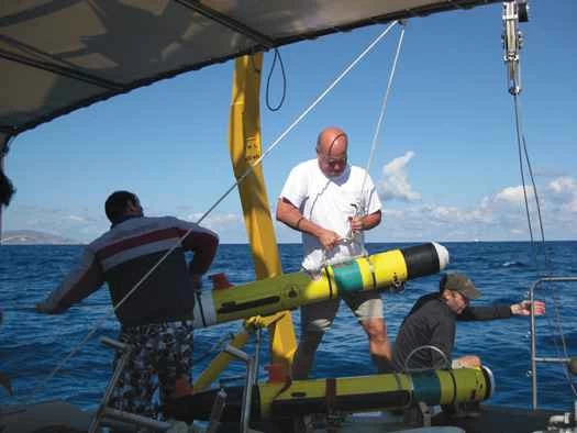 ディアへの遠足から数日後、グレッグ・パッカードがヘラクリオン沖でロボット操作のデモンストレーションを即興で見せてくれた。マサチューセッツ州のウッズホール海洋研究所の細身の技術者であるパッカードは、調査船アルキオンの船尾でバランスを取りながら、手の届かないところに浮かぶ長さ5フィートの黄色い魚雷に棒を突き立てていた。その魚雷は実際にはウッズホールから借り受けた37万5000ドルの自律型ロボット、レムス100で、ビデオカメラを搭載していた。80分間の調査の3分の1が経過した時点で、ロボットに水漏れが発生した。ロボットは自動的にミッションを中止し、船に戻った。パッカードは棒でロボットの上部にループを引っ掛け、アルキオンのウインチに引き寄せて船上に引き上げようとしていた。