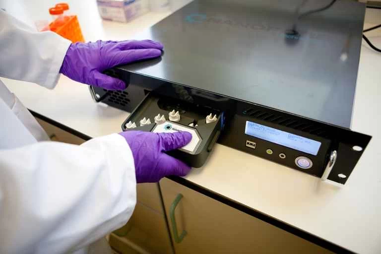 ナノポアとそのマイクロウェルからなるアレイ全体が、一般的な半導体製造技術を用いてチップ上に埋め込まれ、使い捨てカートリッジに挿入されます。各カートリッジは、ナノポアがDNA、タンパク質、薬剤、その他の化合物など、特定の分子を感知するように調整されています。ユーザーはカートリッジを、昔ながらのVCRのようなGridIONノード、またはやや太めのUSBスティックのようなMinIONシステムなど、選択したシーケンシングノードに挿入します。