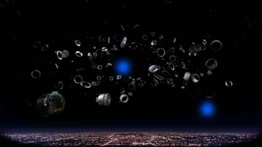 星空に照らされた夜の街並みに、GE社製のジェットエンジン部品が無秩序に積み重なり、それぞれが精細な3D空間でゆっくりと回転しています。システムからヒントを得て、手振りでエンジン部品を組み立てていきます。部品をクラスター状に集めると、GEnxエンジンの大きな部品が自己組織化されます。そして、大きな部品を組み立てて完成したエンジンを完成させ、ジェット旅客機に取り付け、はるか彼方へと飛んでいきます。