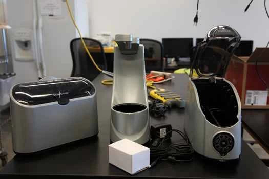 研究室は、建築と芸術の卓越性でも知られるクーパー・ユニオンの工学部にあります。内部には、これら3つの分野すべてが見事に反映されています。階段は段ごとに長さが異なっており、エレベーターには中世の鎖かたびらが飾られています。階段を上っていくと、研究室長のグレッグ・ロイブル氏と研究開発マネージャーのマイケル・グティエレス氏が、すべての機器を新しい部屋に移したばかりだと説明してくれました。辺りにはたくさんの電線やチューブが散乱しています。隅には、予想通り、水槽の隣に冷蔵庫が置かれています。テーブルの上には最新のプロジェクトがいくつか置かれ、片隅にはクーパー・クーラーが置かれていました。