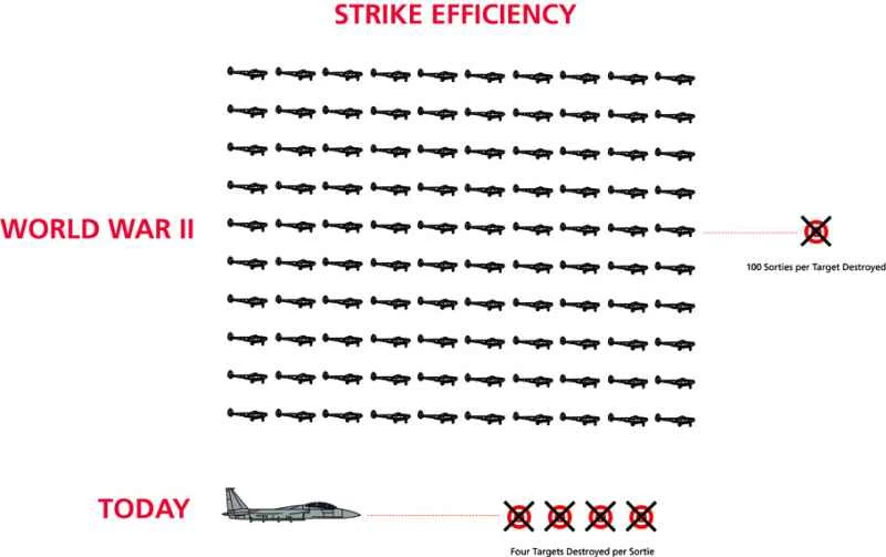 2001年のアフガニスタンでは、軍用機1機あたり平均4.07個の標的を破壊しました。第一次世界大戦以降、技術の進歩によりこの方程式は完全に逆転し、標的あたりの出撃回数ではなく、出撃あたりの標的数で語られるようになりました。
