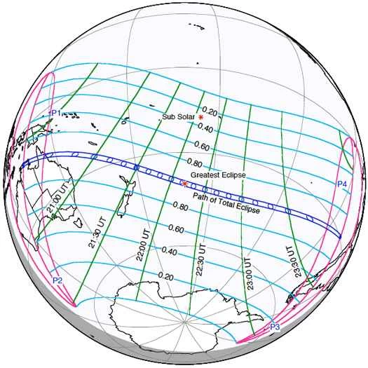 フィードがうまく表示されない場合は、NASAのパートナーであるEclipse Cairns Australiaのフィードをご覧ください。NASAのウェブサイトでは、今回の皆既日食に関する驚くほど正確な詳細情報も公開されており、日食の経路全体を示す地図(下記)も掲載されています。