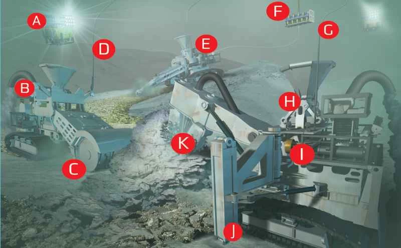 4.補助カッター機(H)は、海底の急峻で不均一な場所から岩石を採取します。調整可能なブームに取り付けられた200個のタングステンカーバイド製歯(K)が岩石を細かく砕きます。その後方に続くバルクカッター機(B)は、3インチの歯を備えた回転シリンダー(C)を用いて、平坦な場所から岩石を採取します。