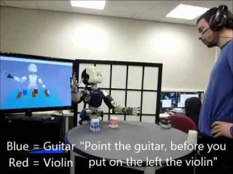 下の動画のように、研究者がiCubに「ギター」(青で描かれている)を指さし、次に「バイオリン」(赤で描かれている)を動かすように指示します。まるで未来の奇妙なE-Tradeの広告のように、iCubの赤ちゃんのような頭が大人の男性の声で話しかけ、指示を理解し、正しく実行していることを確認します。そして、完了後に念のため確認を行います。