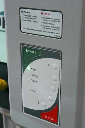 Civic GXは8月上旬にPopSciに納品されましたが、Phillステーションの設置には数週間かかりました。これは、FuelMakerの設置業者が必要な許可を得るために、地方自治体や州の条例のハードルを越えなければならなかったためです。これはニュージャージー州で設置された2台目のユニットであり、様々な政府機関が初めて目にしたものでした。また、私の家の電気系統に問題があり、ユニットが何度もブレーカーを落とすことがありました。それが解決すると、Phillは見事に機能しました。使い方は驚くほど簡単です。毎晩帰宅し、ノズルを車のコンセントに差し込み(接続はしっかりしており、誰かがプラグを抜かずに走り去った場合に備えて、ブレークアウェイ機能も備えています)、スタートボタンを押すだけです。静かなファンが作動し、給油プロセスが始まります。