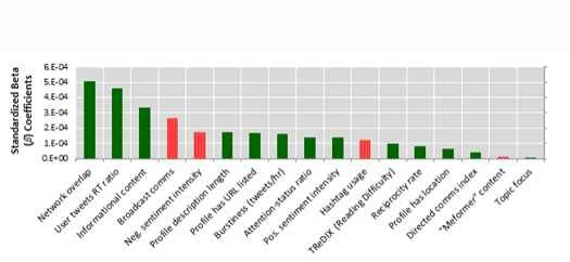 「リツイートに値する」ことはフォロワー数増加に繋がります。リツイートは「デジタル公共財」であり、元の投稿者の帰属表示と情報コンテンツの両方を提供するからです。より絞り込んだトピックに焦点を絞ったアカウントはより多くのフォロワーを獲得し、「ツイート読みにくさ指数」の高いアカウント、つまりより文章が巧みに書かれたアカウントも同様に多くのフォロワーを獲得しました。「ハッシュタグの乱用」は批判要因リストの上位にランクインしました。