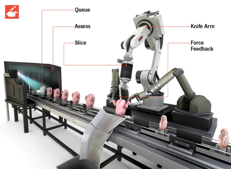 胸肉から翼を取り除くには、ロボットアームがナイフで鶏の鎖骨を切り込み、肩に向かって移動し、肩関節を切り、肩甲骨に沿って鶏の背中側を下っていく。これらはすべて 2 秒以内で行われる。