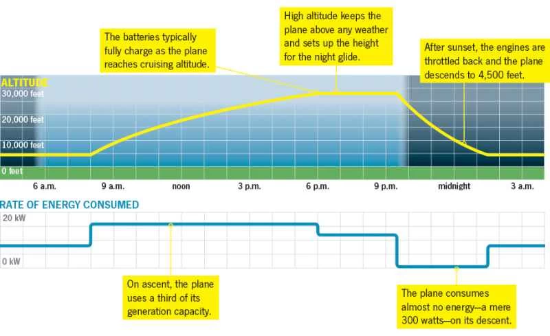 日中、ソーラープレーンは高度27,000~28,000フィートまで上昇します。日が沈むと、プロペラはエネルギーを節約するためにスロットルを絞り、機体はゆっくりと高度4,500フィートまで降下します。太陽が昇り、バッテリーの充電が始まるまで、機体はその高度に留まります。チームの気象学者は、風や雲量の予測を考慮し、日中の上昇に最適な時間帯をシミュレーションで決定します。