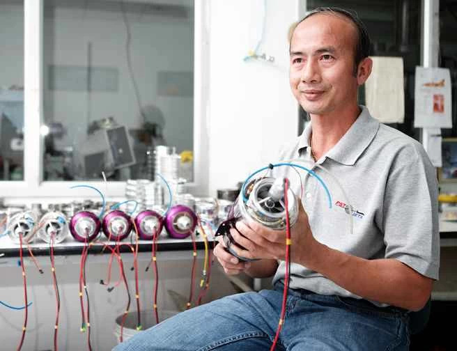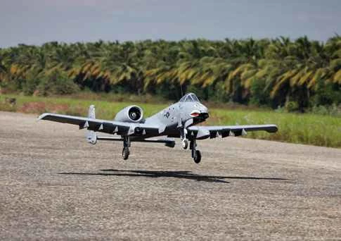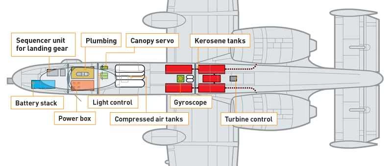 セルビー氏とサエショール氏のバンコクを拠点とするスケールジェット企業、PSTエンジンズ社は、燃焼室に追加の気化器と高度なデジタル燃料制御装置を追加することで、小型ジェットエンジンの加速を向上させている。耐熱超合金で作られ、フルセラミックベアリングを装備したA-10のエンジンは、毎分12万回転まで回転し、最大29ポンドの推力を発生する。サエショール氏によると、同重量あたりの推力は市場のどの機体よりも大きいという。両翼を取り付けると、セルビー氏の5.5:1スケールのA-10は幅10フィートに広がり、離陸時の重量は65ポンドになる。胴体内部では、カーボンファイバーが5つのケブラー燃料タンクの周りをスパゲッティのように蛇行しており、約15分間の飛行に十分な8.5リットルのジェット燃料が貯まる。