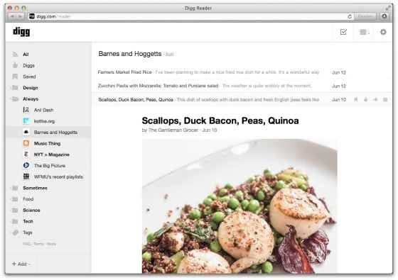 FacebookやTwitterと連携して、自分のソーシャルグループ内での人気度でニュースを並び替えることができる。しかしDiggの新しいリーダーは、従来のRSS入出力と独自のアルゴリズムによる推薦機能を融合させたものだ。Diggのアンドリュー・マクラフリン氏は「非常にシンプルでスピーディーな読書体験になるが、さらにもう1つのツールが追加される。それは、未読記事をインターネット上での人気度で並び替える機能だ」と述べている。このアイデアは3つの柱から成り立っている。世界的な人気度で並び替えること、FacebookやTwitterと連携して自分のソーシャルグループ内での人気度で並び替えること、そして、リツイートやお気に入り、Duggやその他の方法で共有した内容に基づいてDiggがあなたの好みに合うと判断するパーソナライズされたランキングを取得することだ。これは2つの形式を合わせたキメラだ。