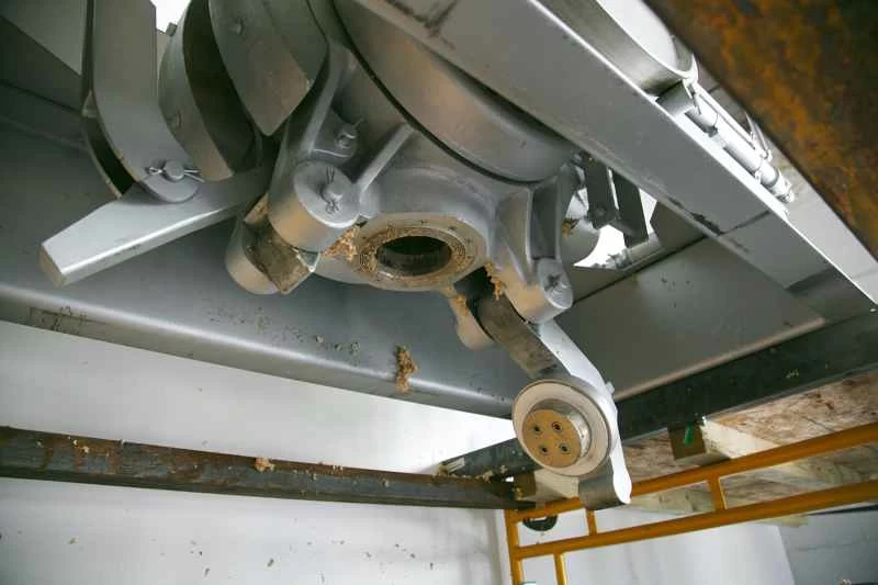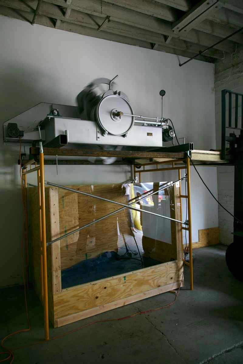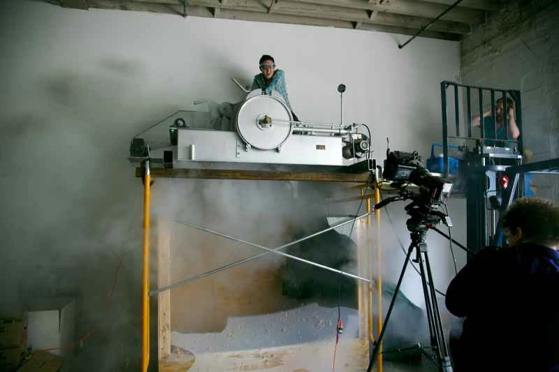 記念すべき初爆のため、大砲は高さ8フィートの足場に設置され、ノズルから煙を集めるためのチャンバーに向けて噴射されました。私は頑丈なGoPro Hero3カメラをチャンバーの床に取り付け、大砲を真上から見下ろしながらその様子を撮影しました。レバーを放すと、急激な減圧により大砲のポートからすべての穀物が噴き出し、サクサクとした小さなスナック菓子が特設の受入室に飛び散りましたが、倉庫内にも散らばりました。右のスローモーション動画をご覧ください。