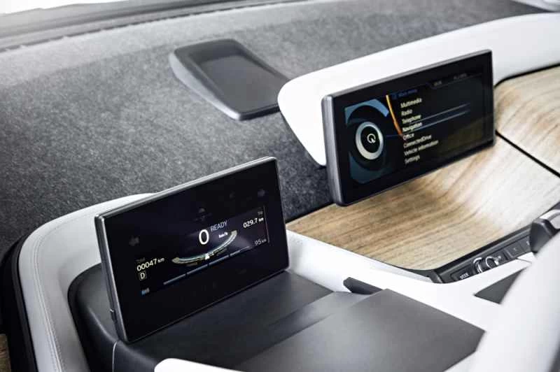 ダッシュボードも超モダンで風変わりです。ナビゲーションなどの従来のディスプレイの代わりに、ダッシュボードにはNexus 7らしきものが2つ(私の知る限り、実際にはNexus 7ではありません)立てかけてあります。運転席側のディスプレイには、エンジン回転数、速度、充電レベルといった一般的なメーターが表示され、中央のまるで浮いているように見えるディスプレイからは、ナビゲーション、音楽、スマートフォンとの接続にアクセスできます。