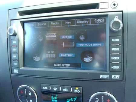 ハイブリッド車特有の機能として、タコメーターの下側の「ペグ」と1,000回転のポイントの間に「オートストップ」インジケーターがあり、タコメーターの右側には「効率」ゲージがあります。エンジンの稼働率を示すだけの従来のバキュームゲージとは異なり、シルバラードの「効率」ゲージはトラックのコンピューターによって制御され、システム全体の稼働状況を総合的に把握できます。効率ゲージの針を12時の位置に維持することで、ガソリン代を最も節約できます。